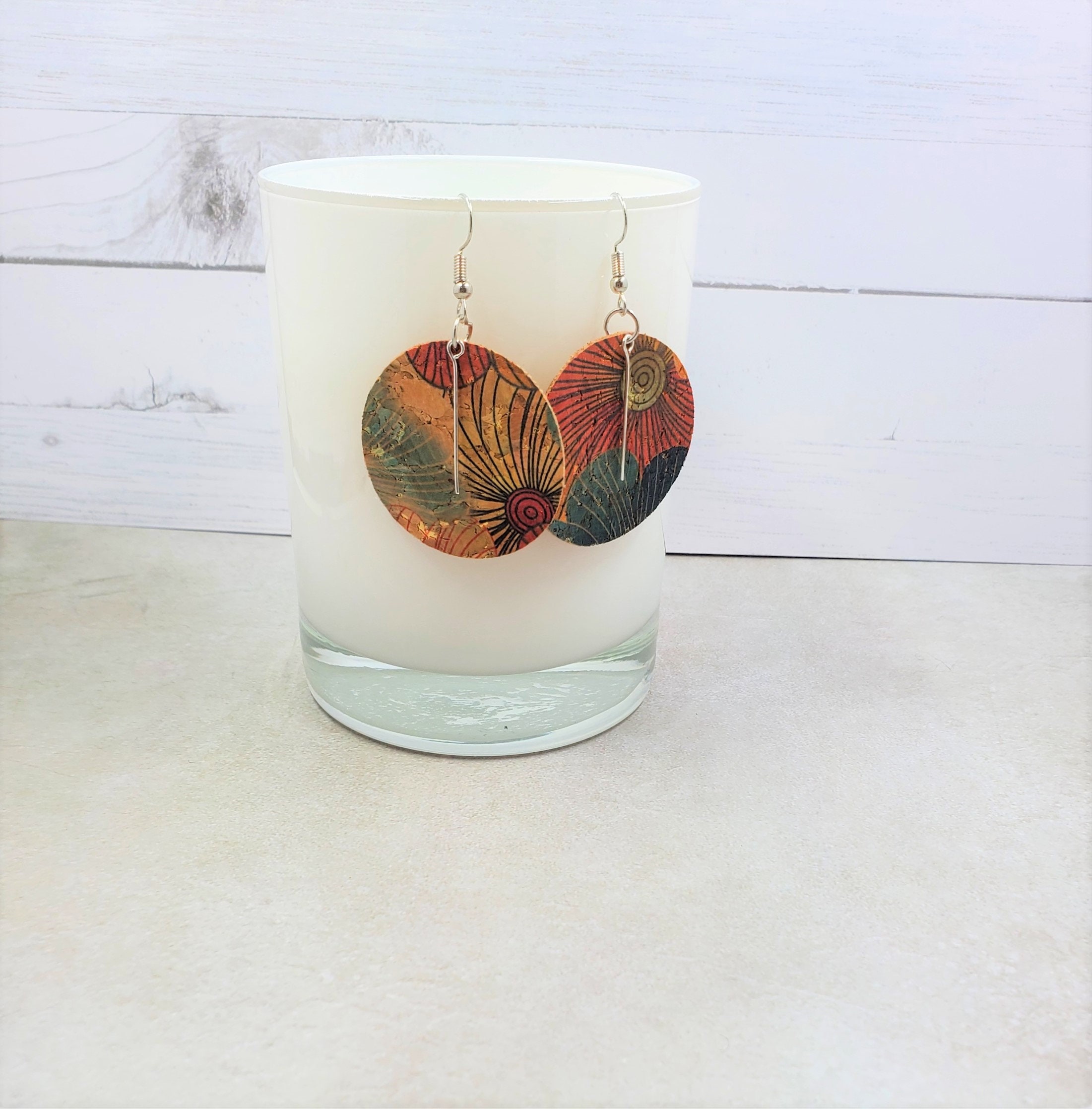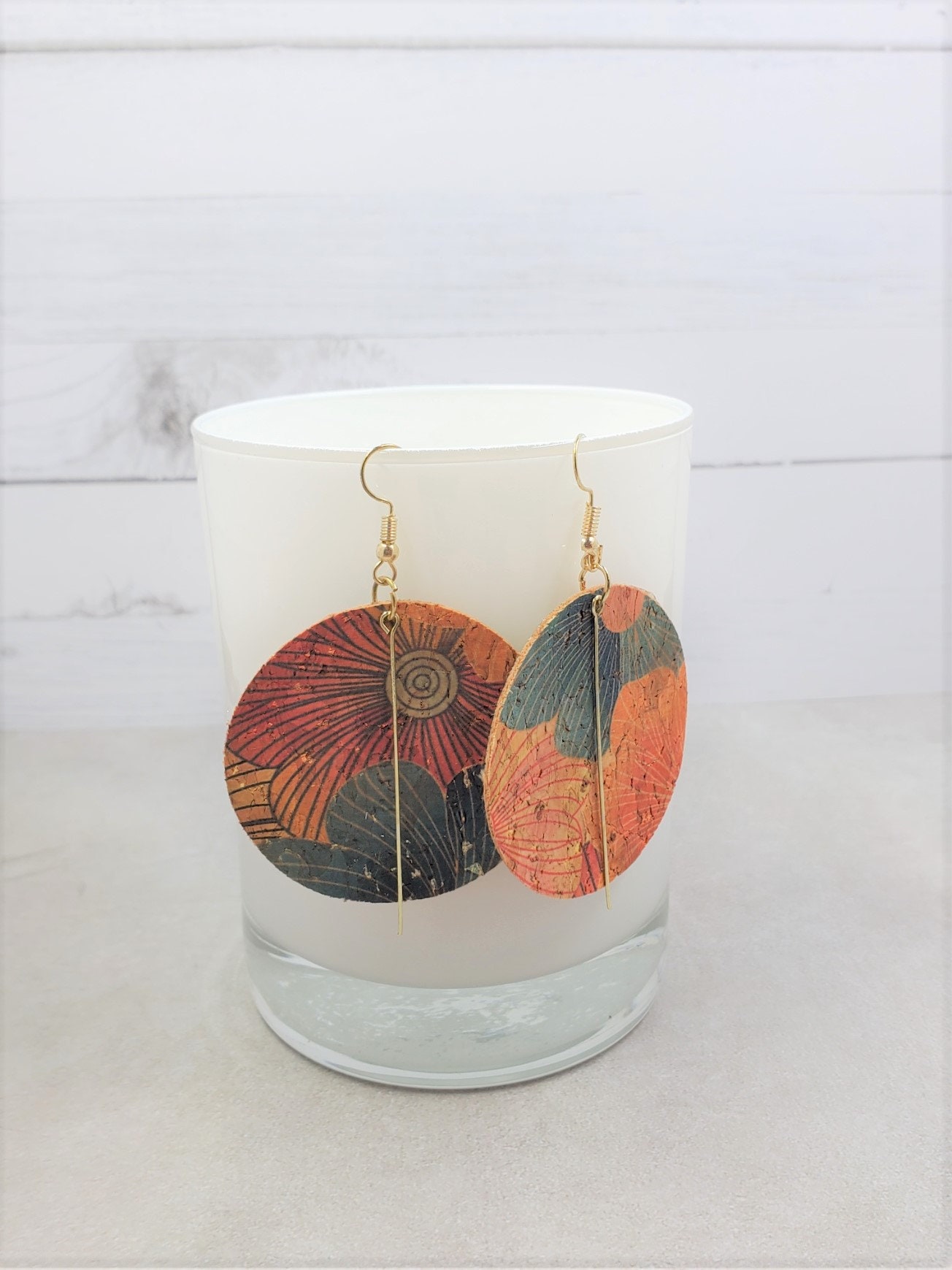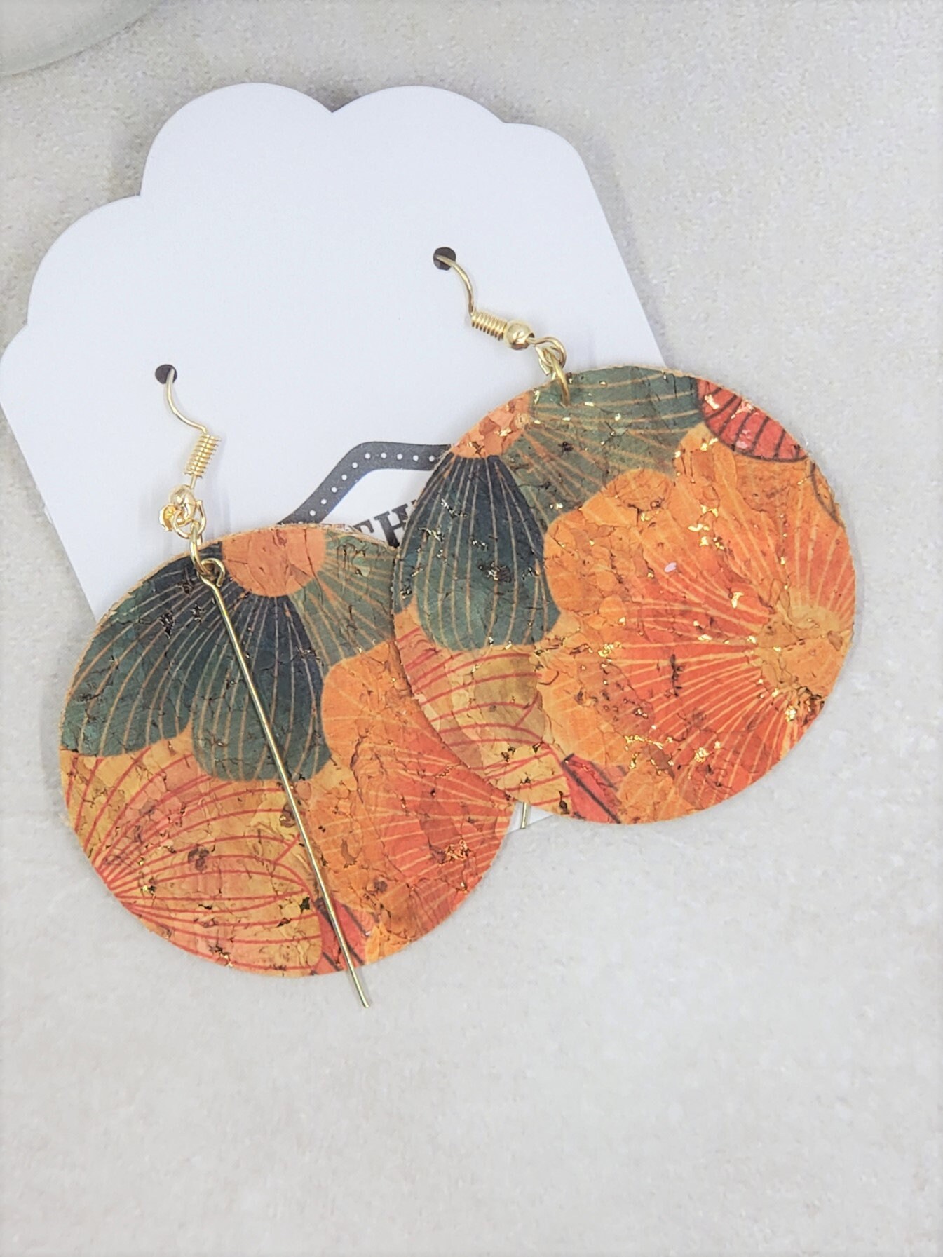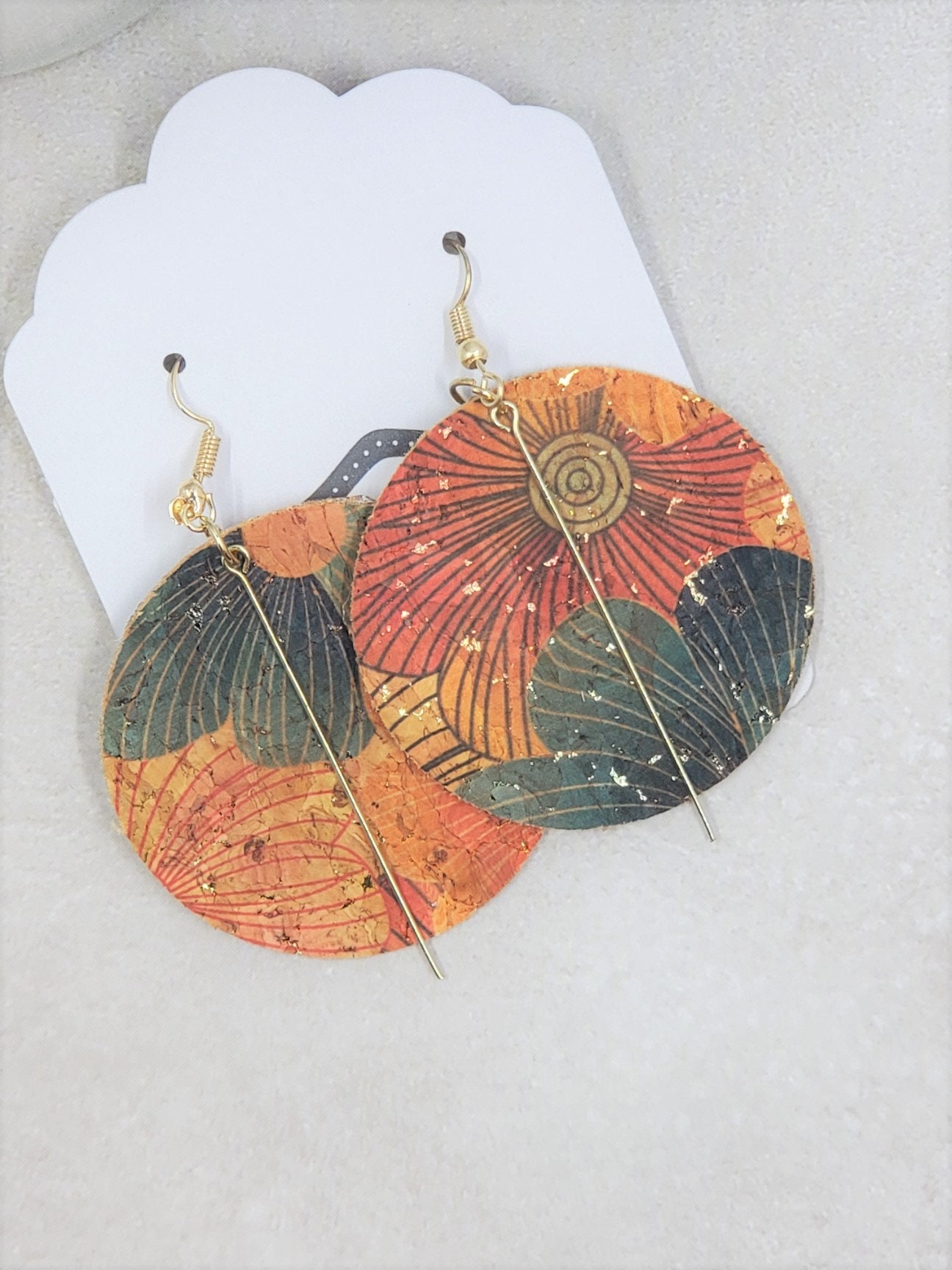 These earrings are round with floral print cork fabric on both sides. You can choose from a gold, bronze, or silver bar charm.