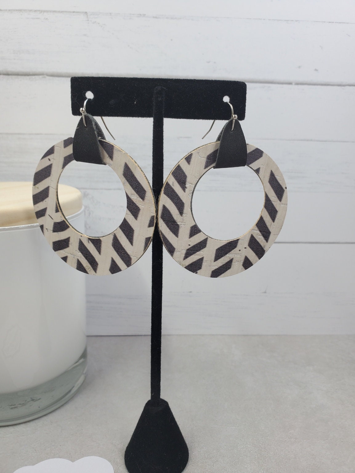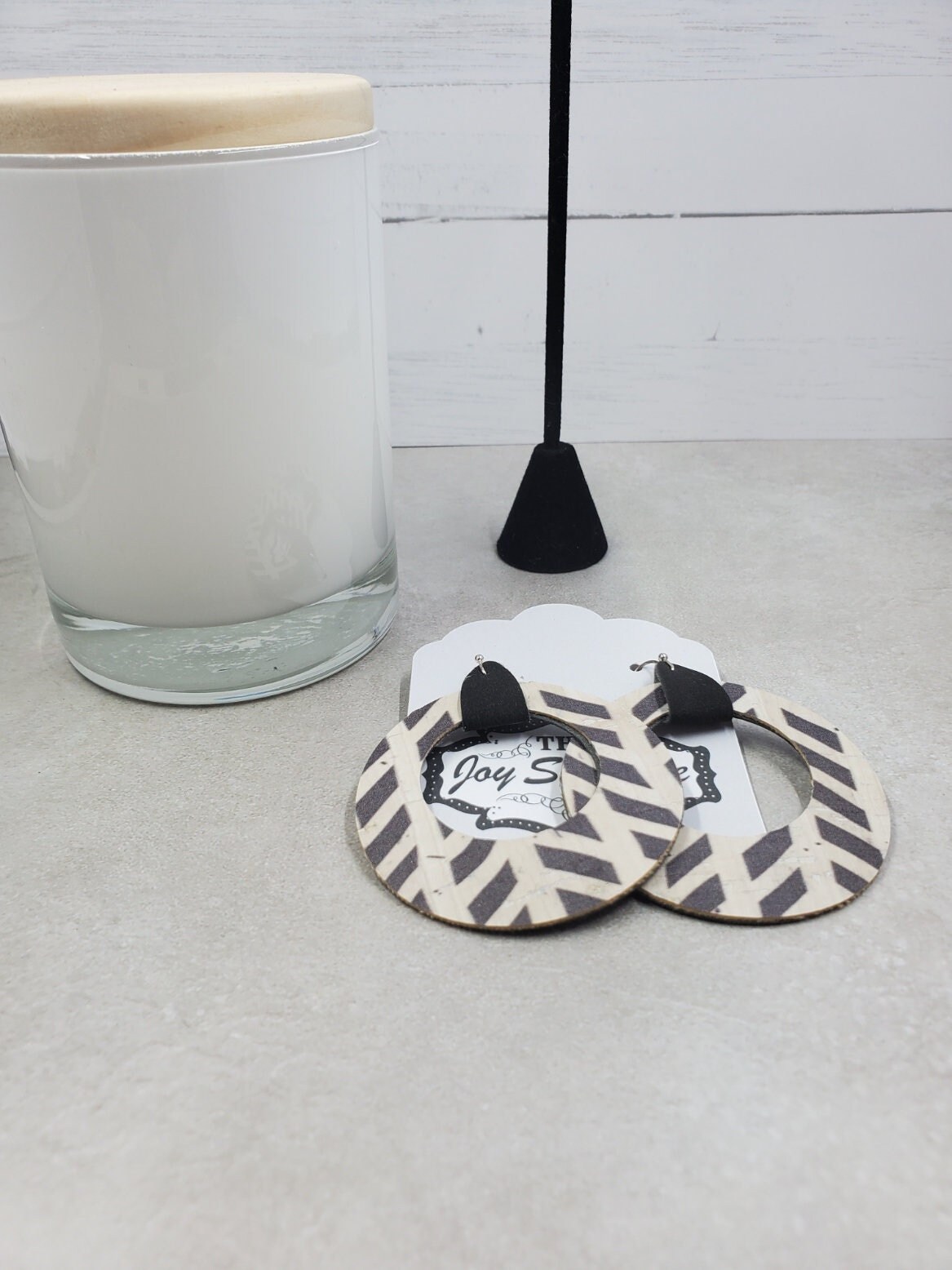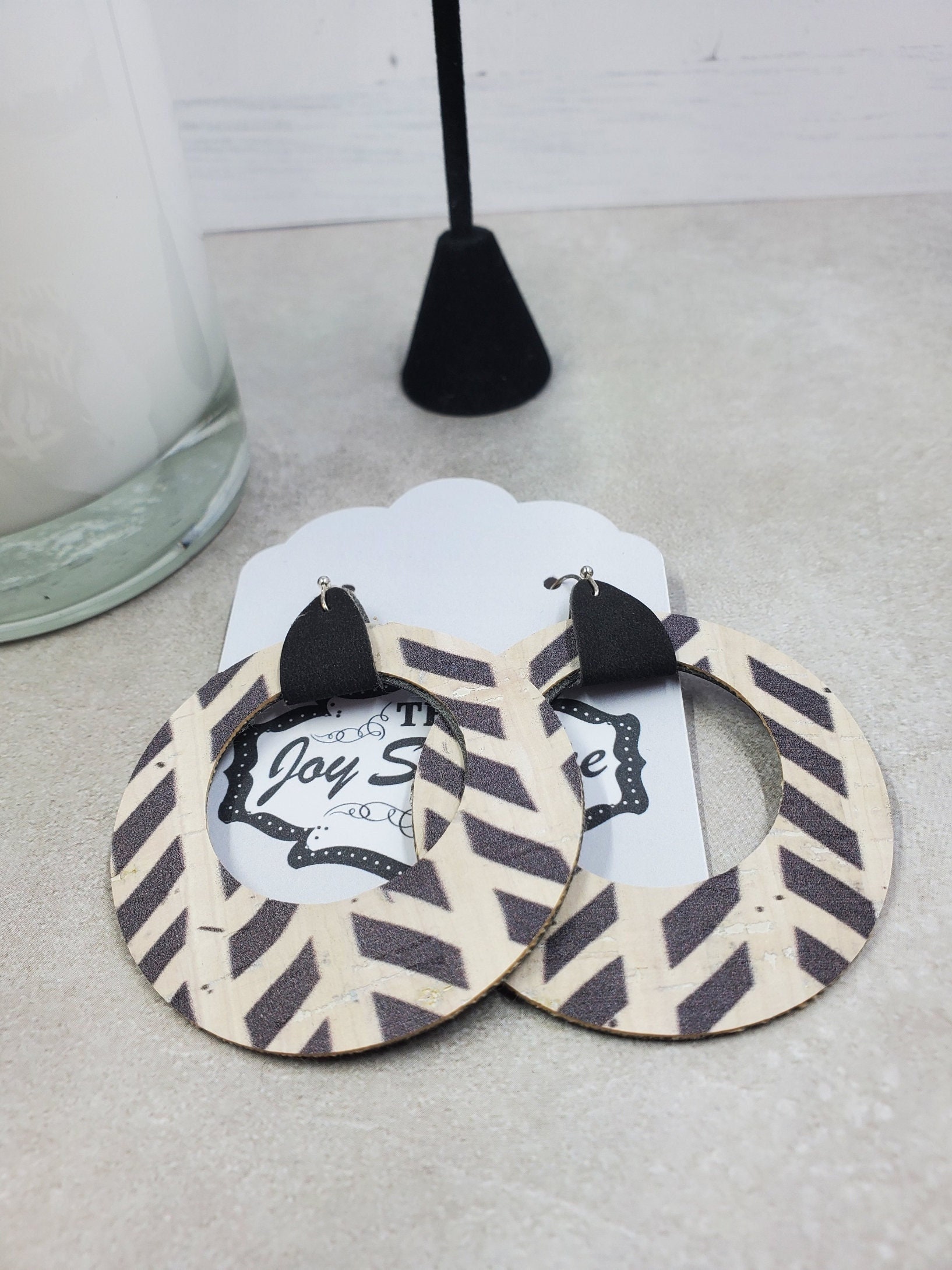 These earrings are round with a black/white chevron style pattern on front and black on back side. Cork is used on both sides.