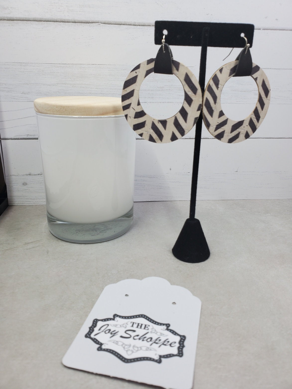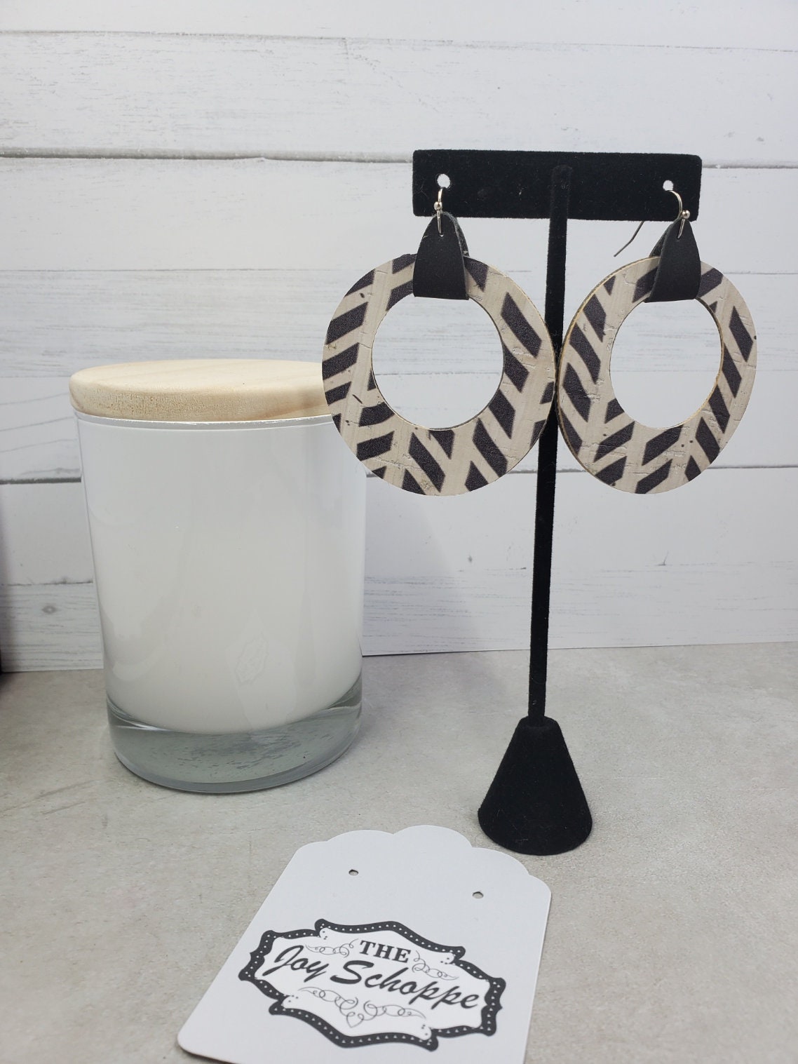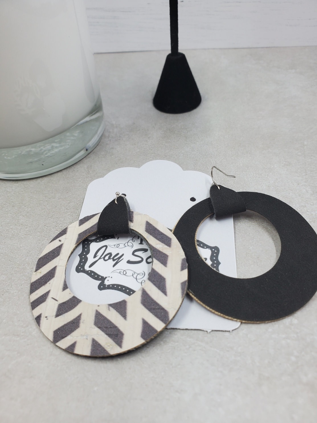 These earrings are round with a black/white chevron style pattern on front and black on back side. Cork is used on both sides.