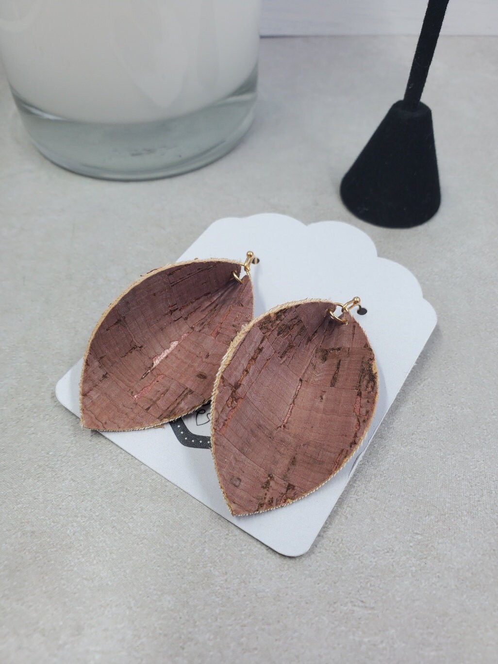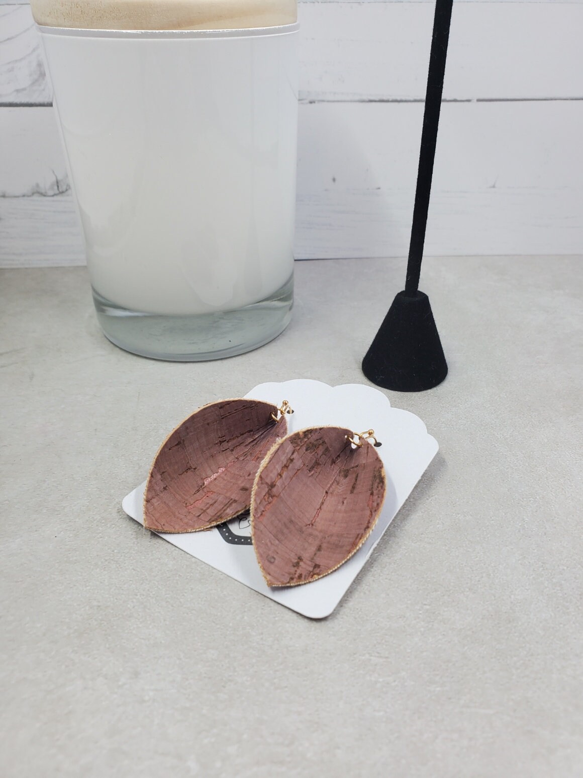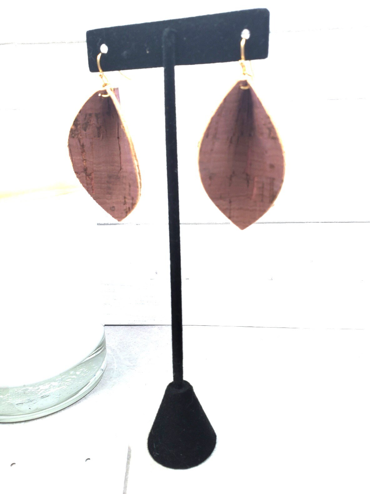 These earrings are folded leaf shaped made with mauve/purple natural cork fabric & a gold hardware.