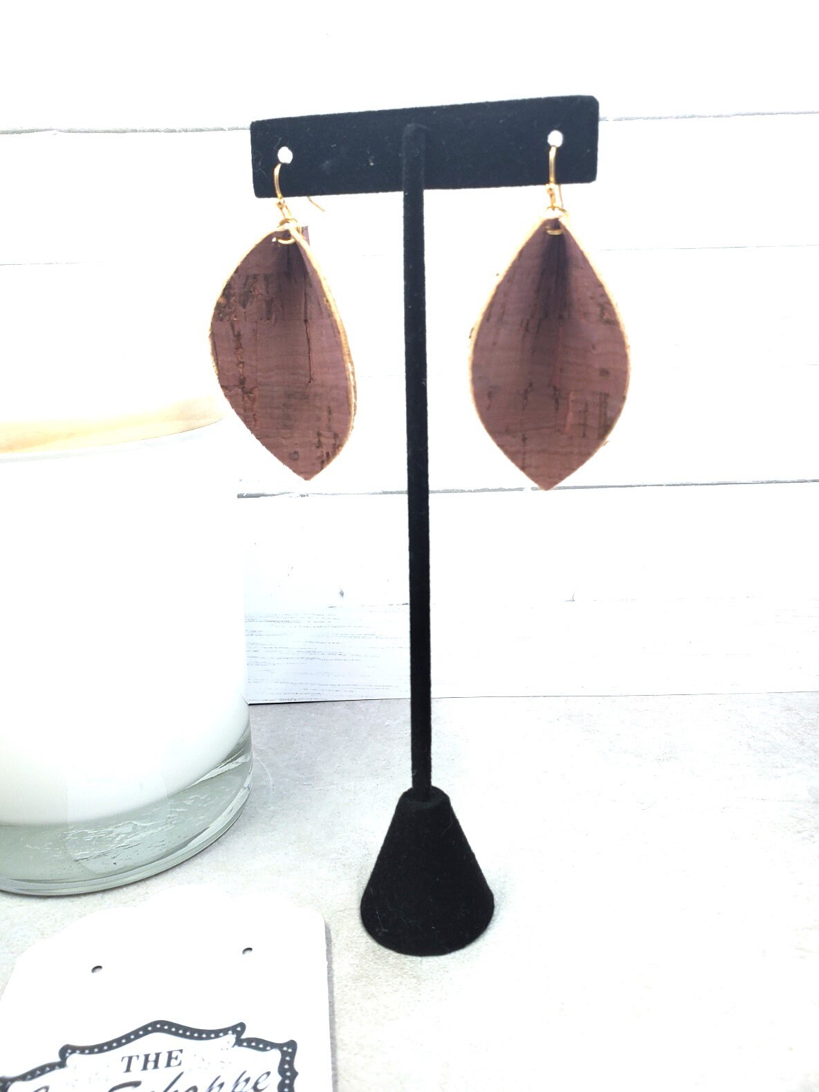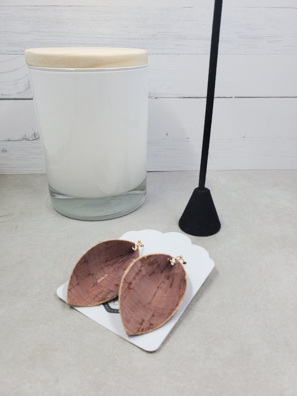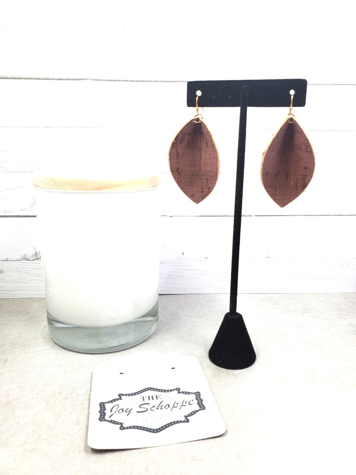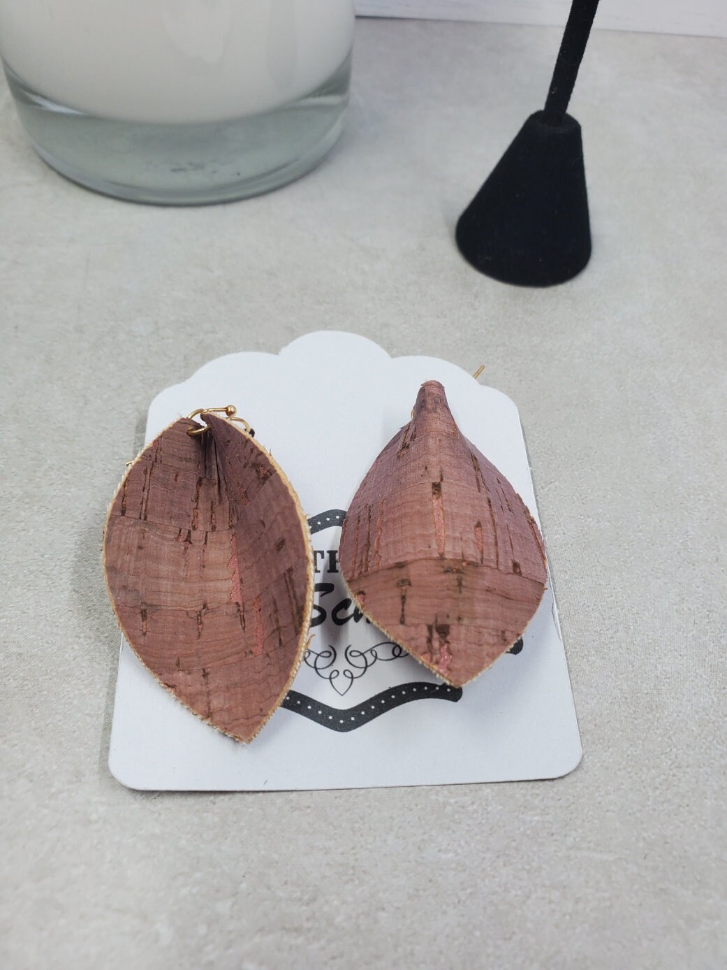 These earrings are folded leaf shaped made with mauve/purple natural cork fabric & a gold hardware.