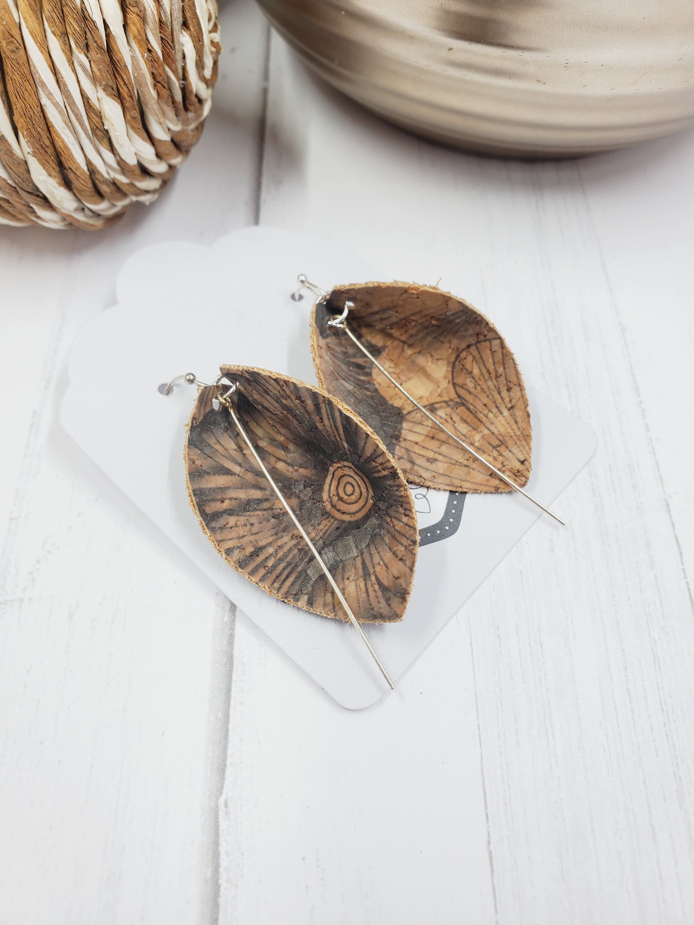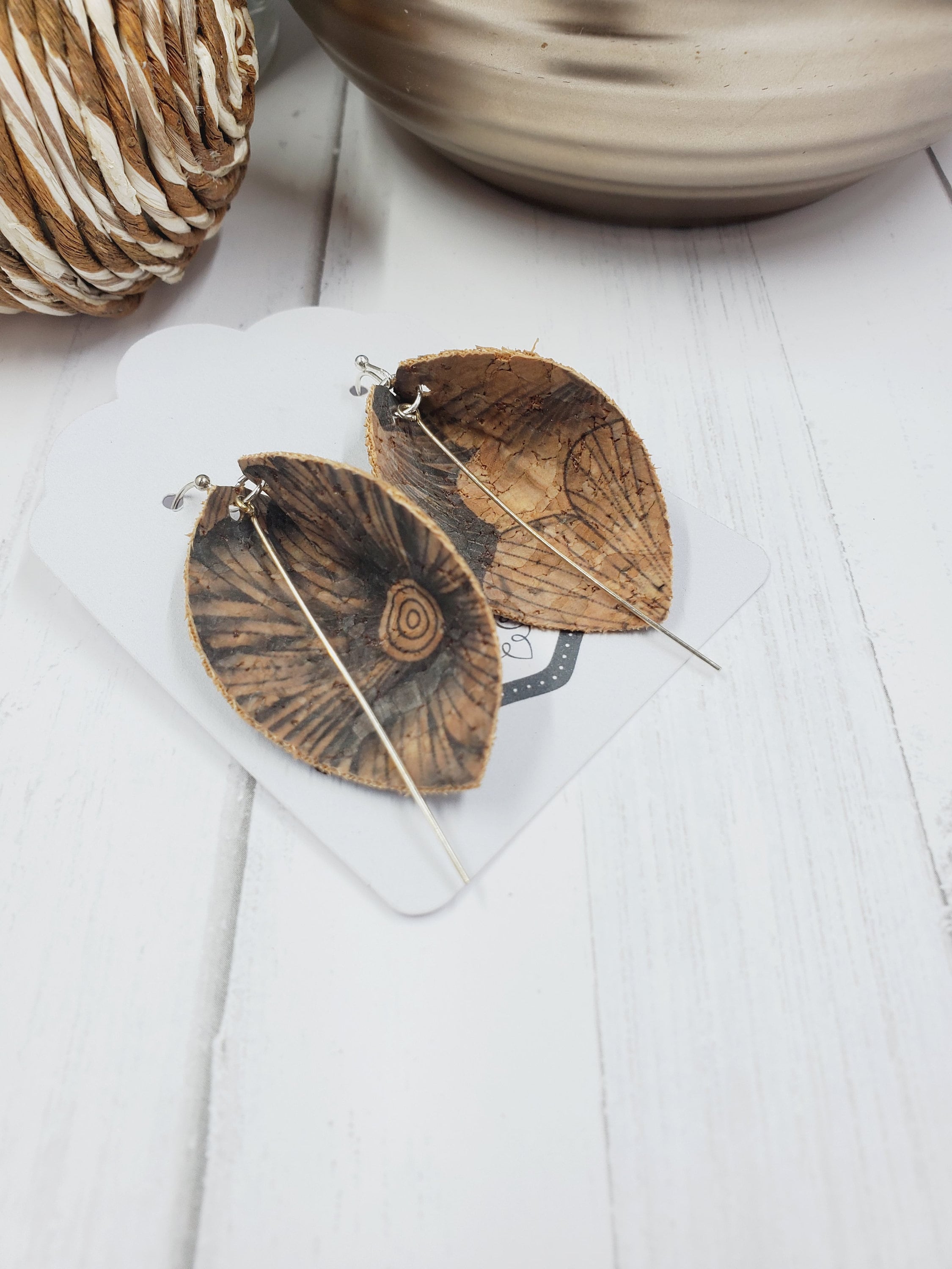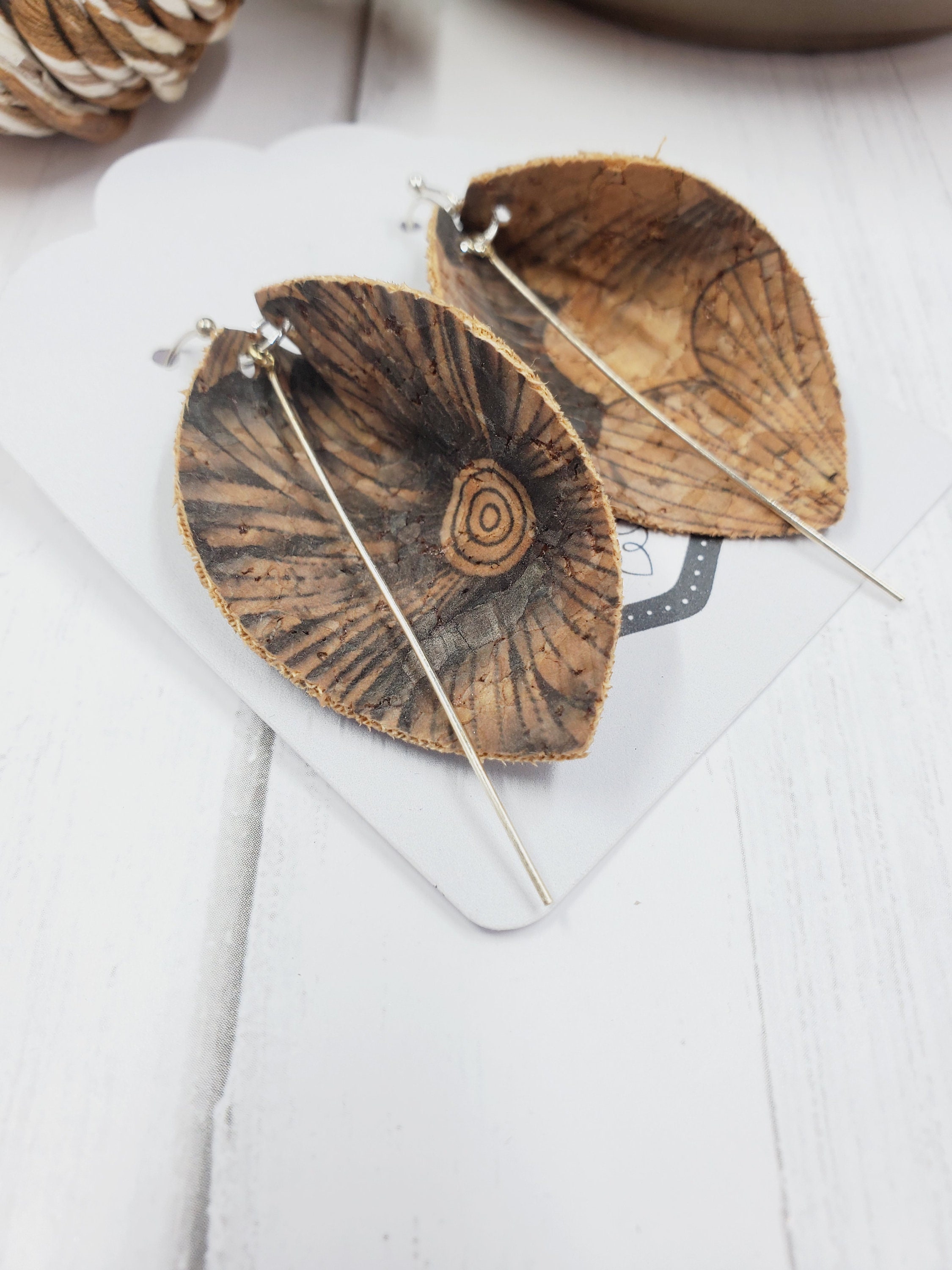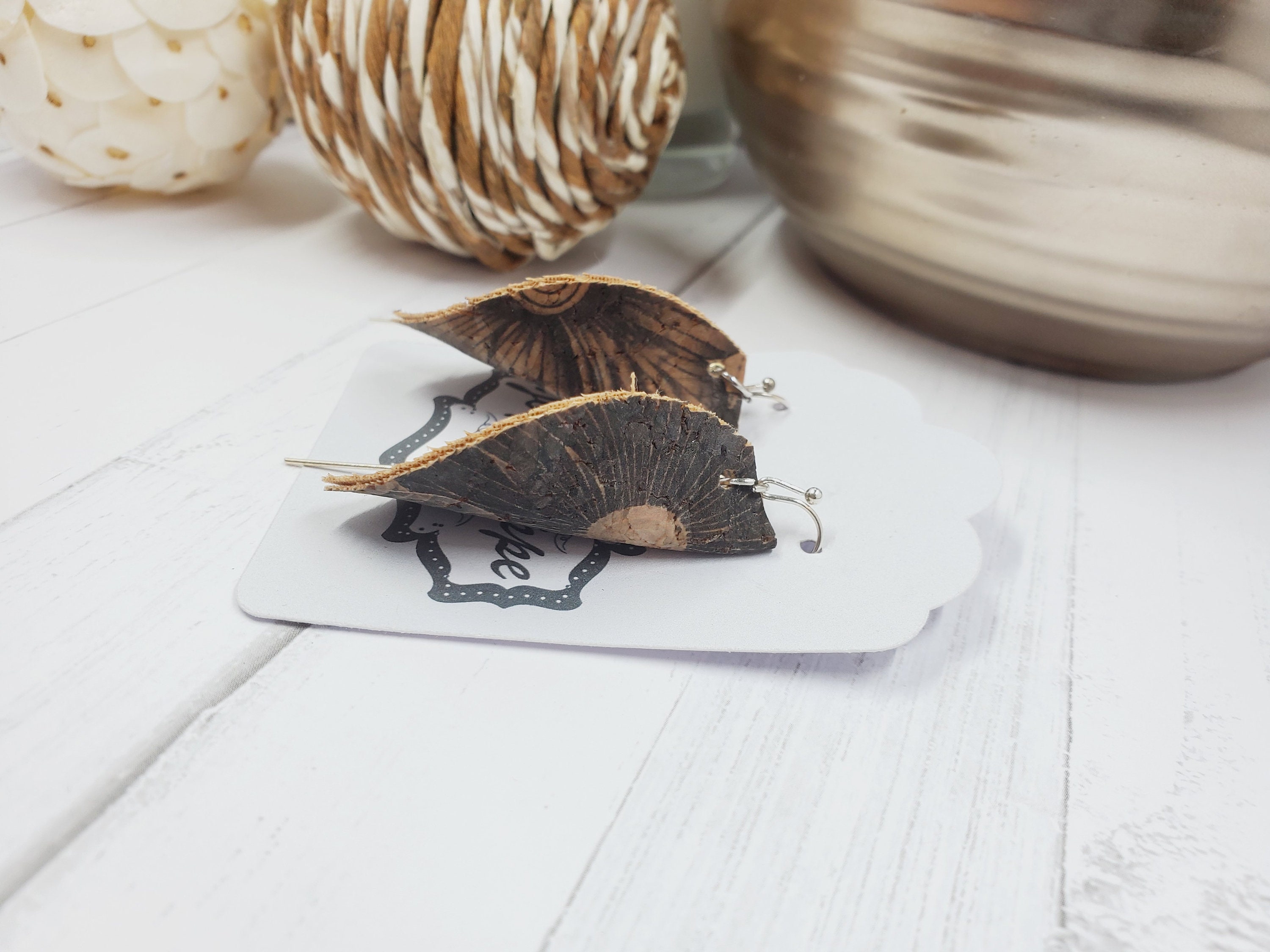 These earrings are folded leaf shaped made with a black & natural cork fabric, silver bar, & silver hardware.