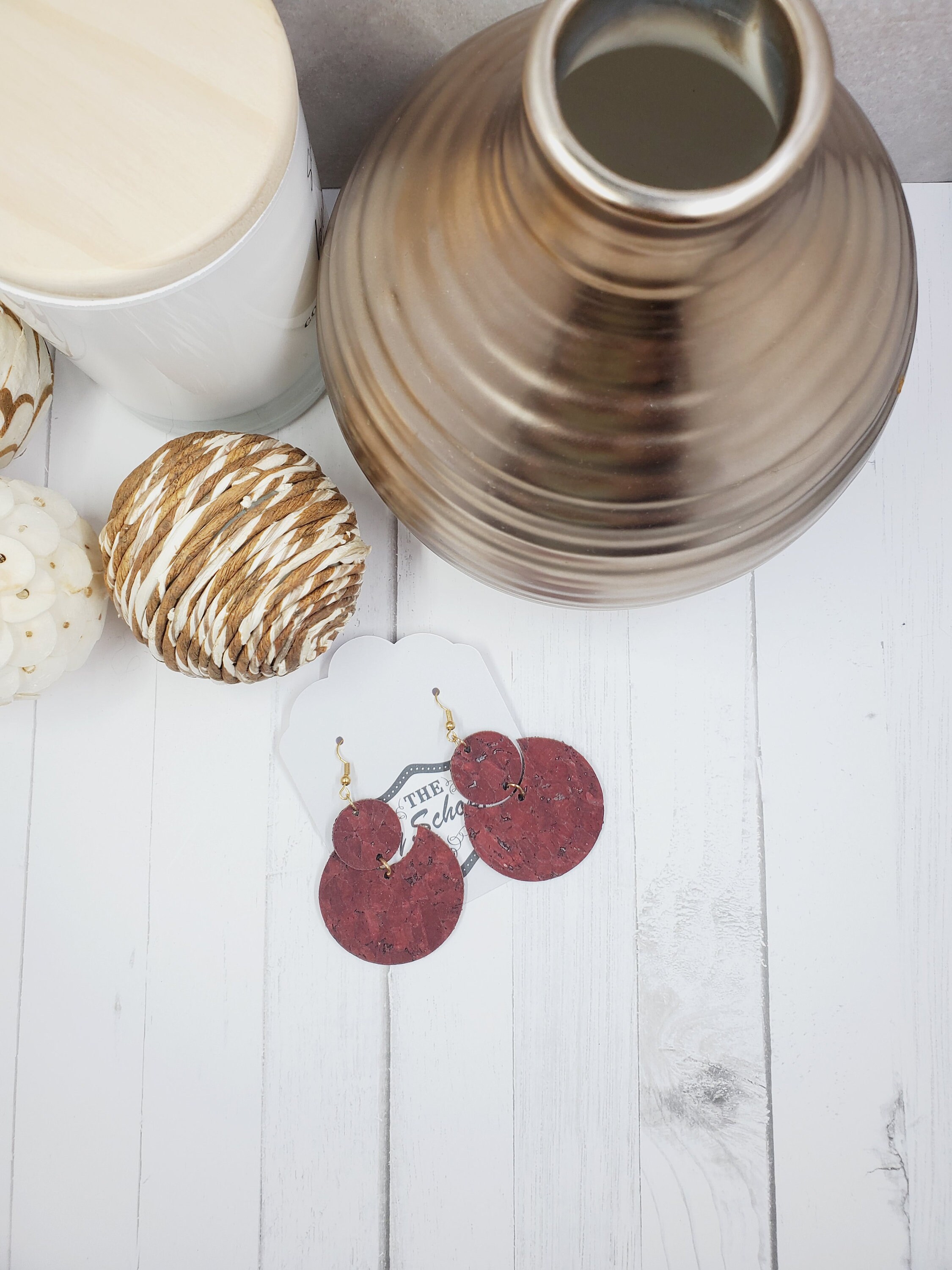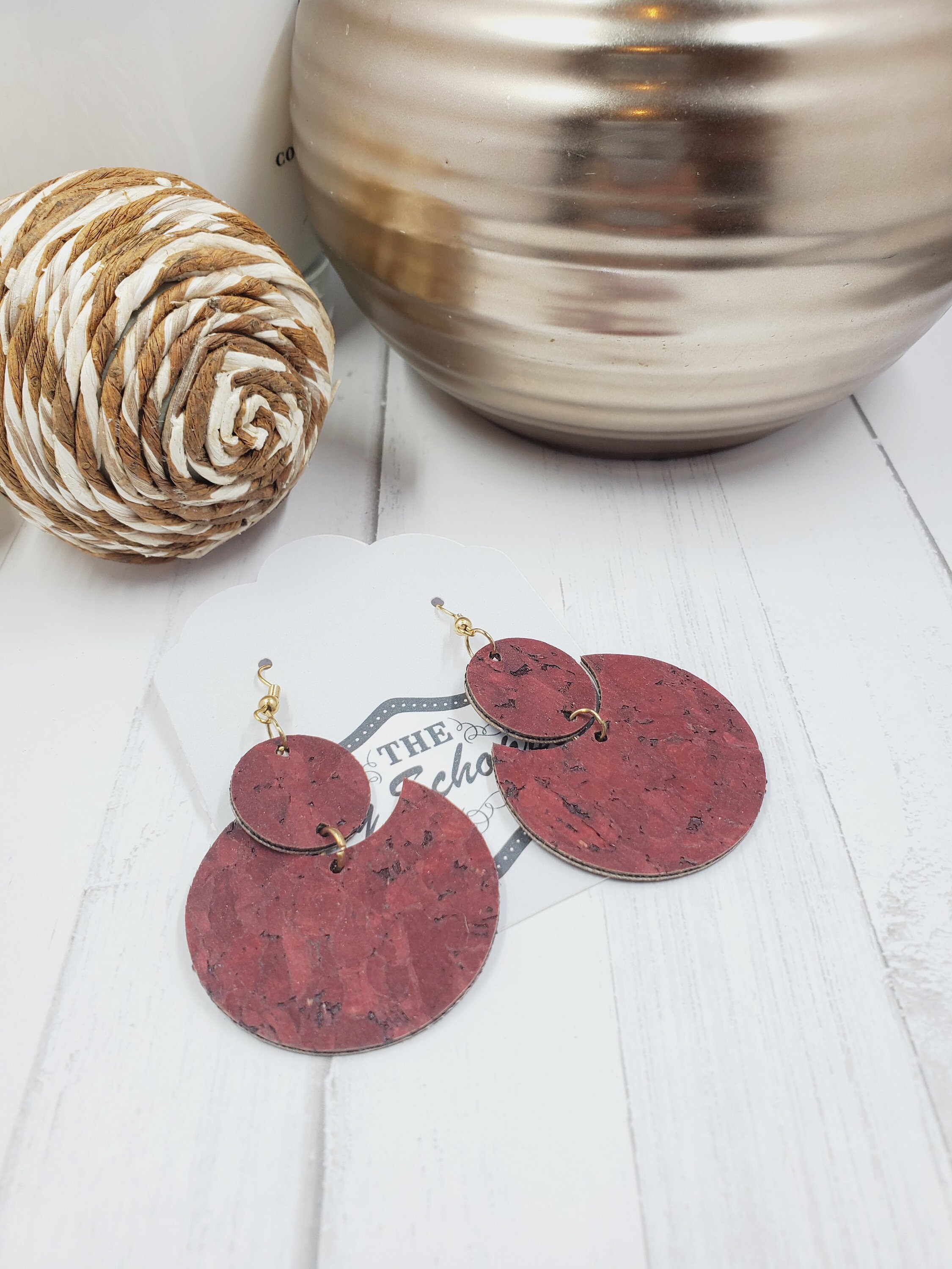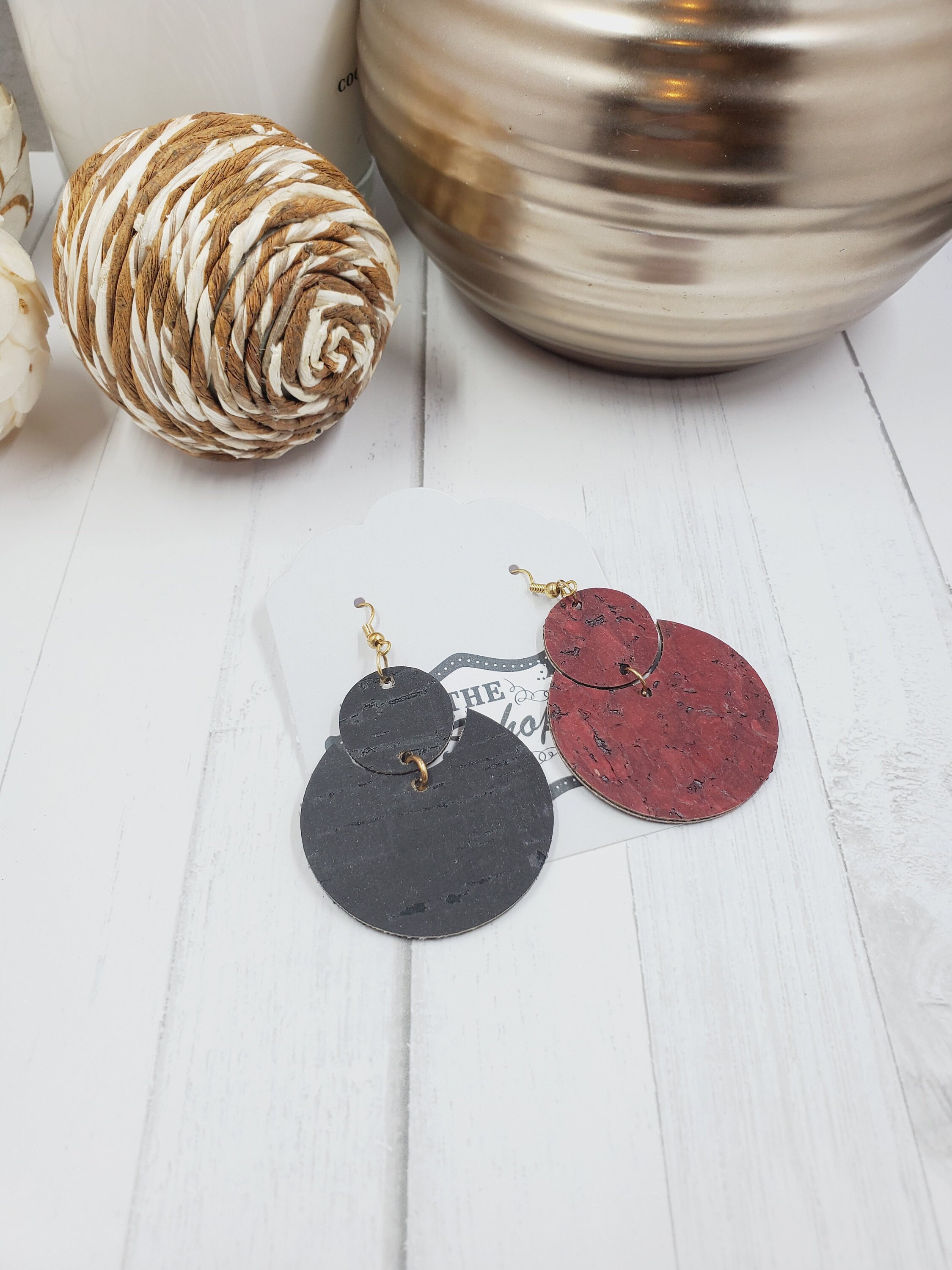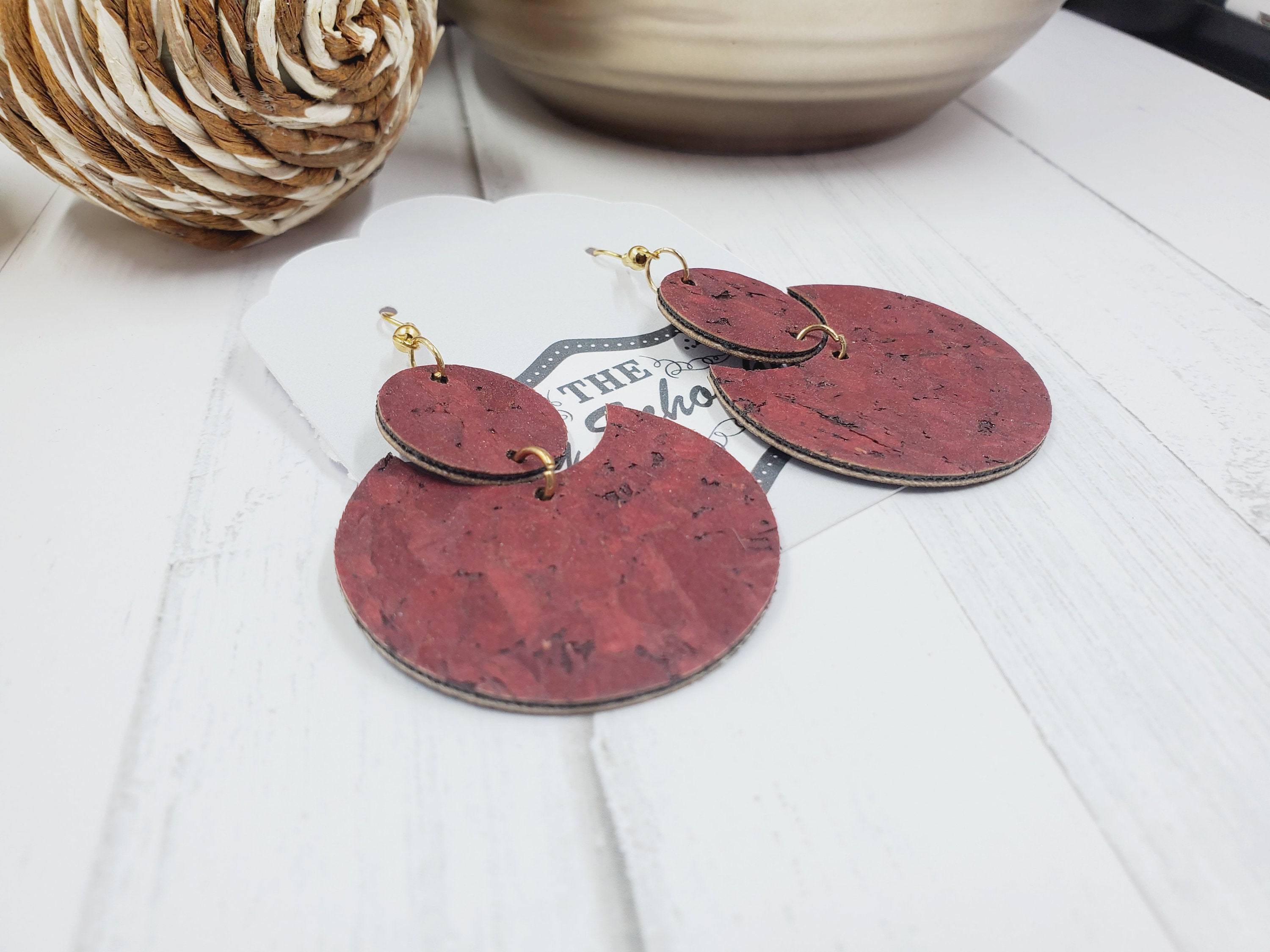 These earrings can be worn with either black or the maroon cork fabric showing making it like 2 earrings for price of one.