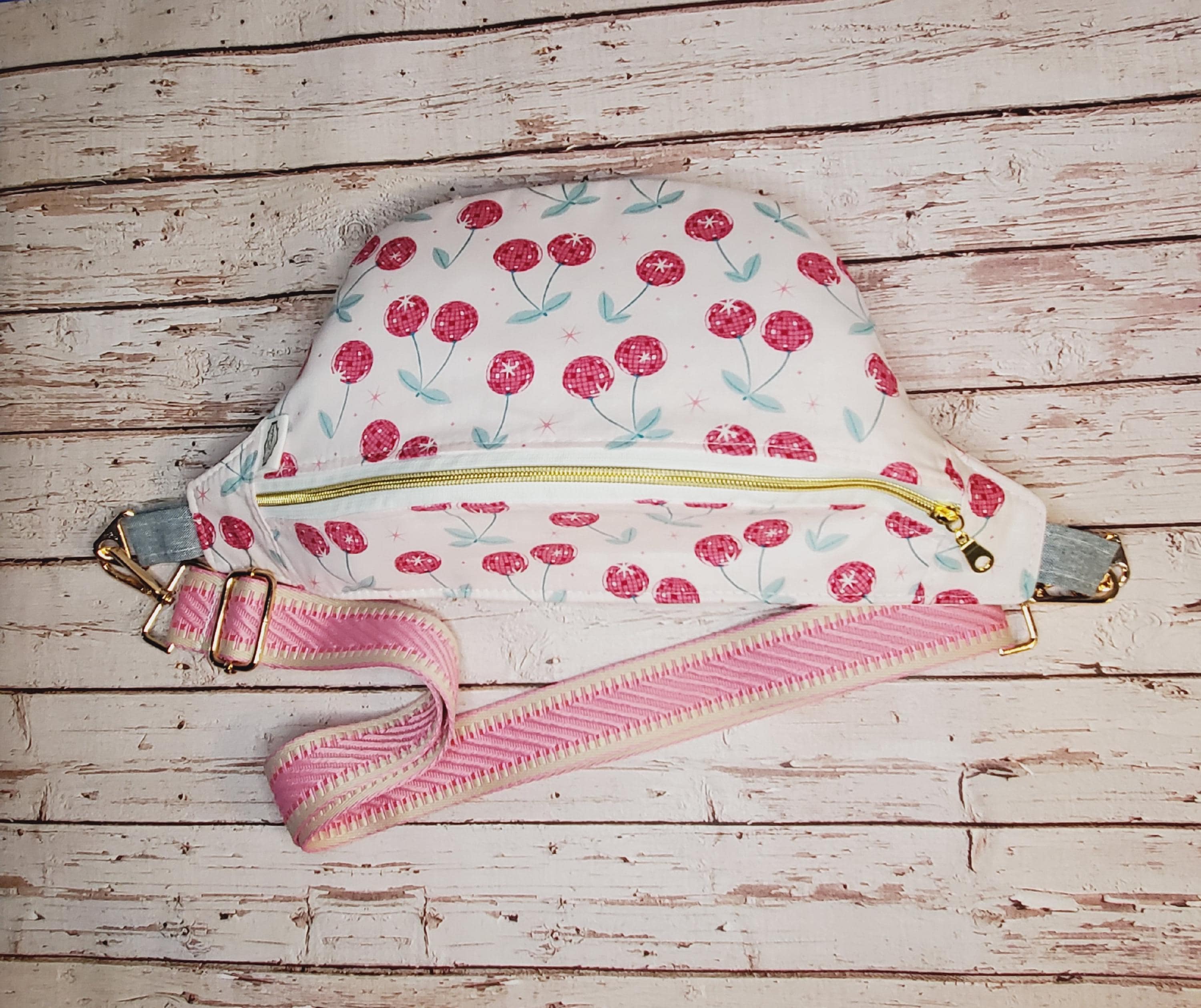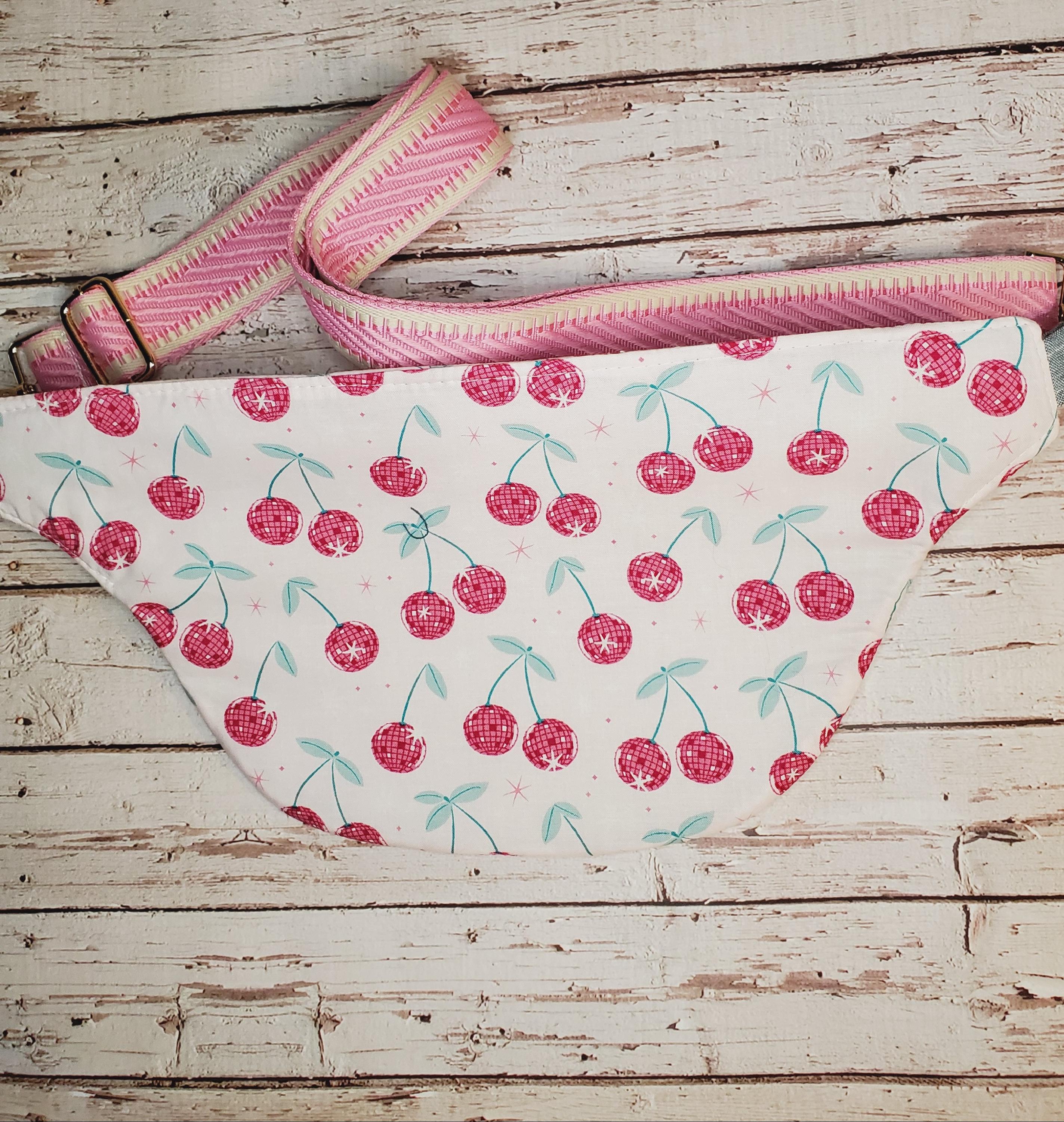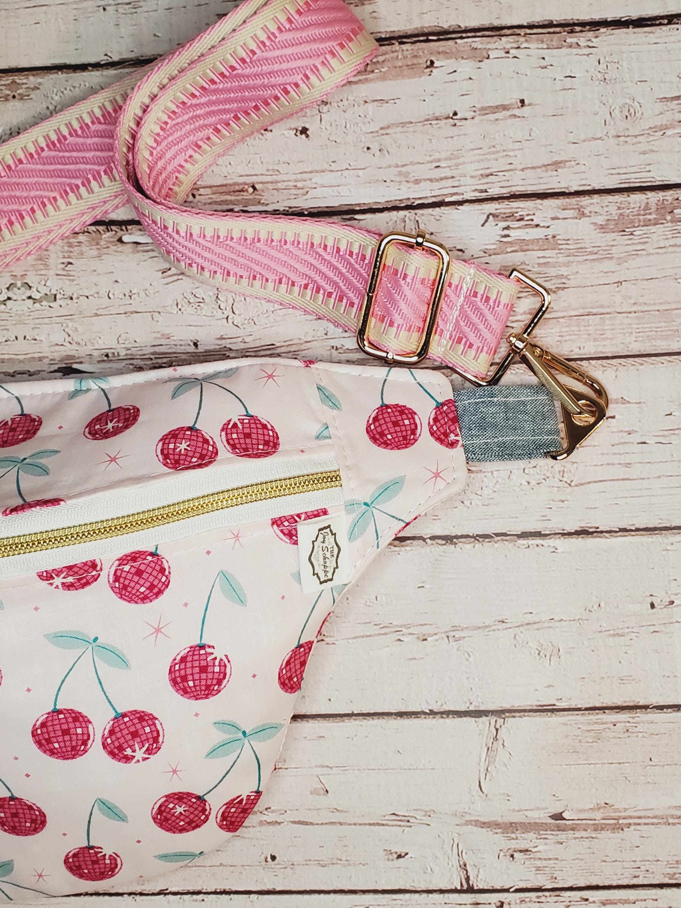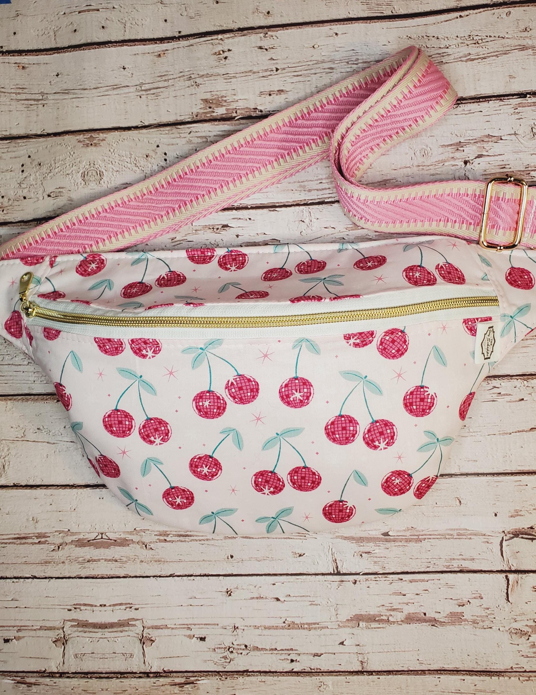 Handmade medium-sized Fanny Pack with this fun soft pink cotton fabric with disco cherries! This soft, woven fabric boasts a pattern of whimsical disco ball cherries!! It is sure to be a showstopper and conversation starter!! Let this beautiful neutral color scheme enhance your latest outfit. This fabric is perfect for all seasons! The accent fabric is a cotton denim blue that coordinates perfectly. The adjustable belt/strap and durable craftsmanship make it the perfect casual travel bag for an active lifestyle.