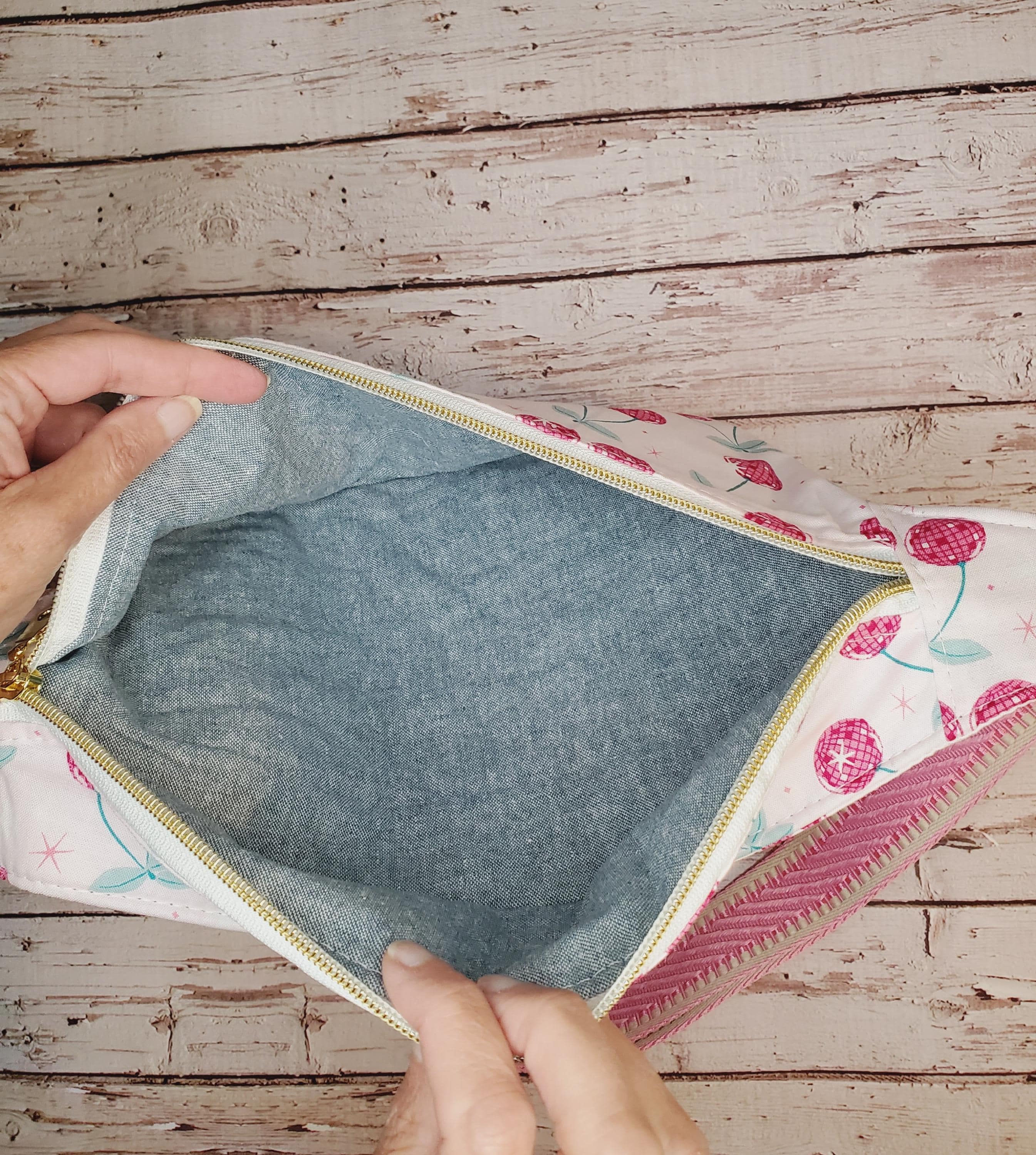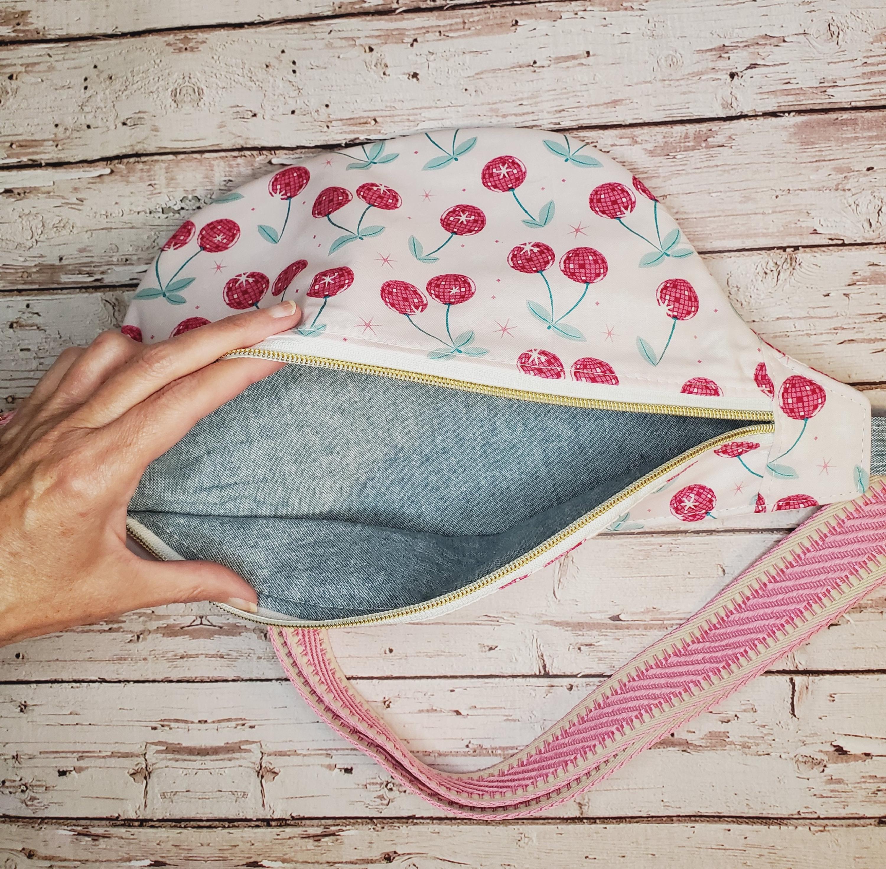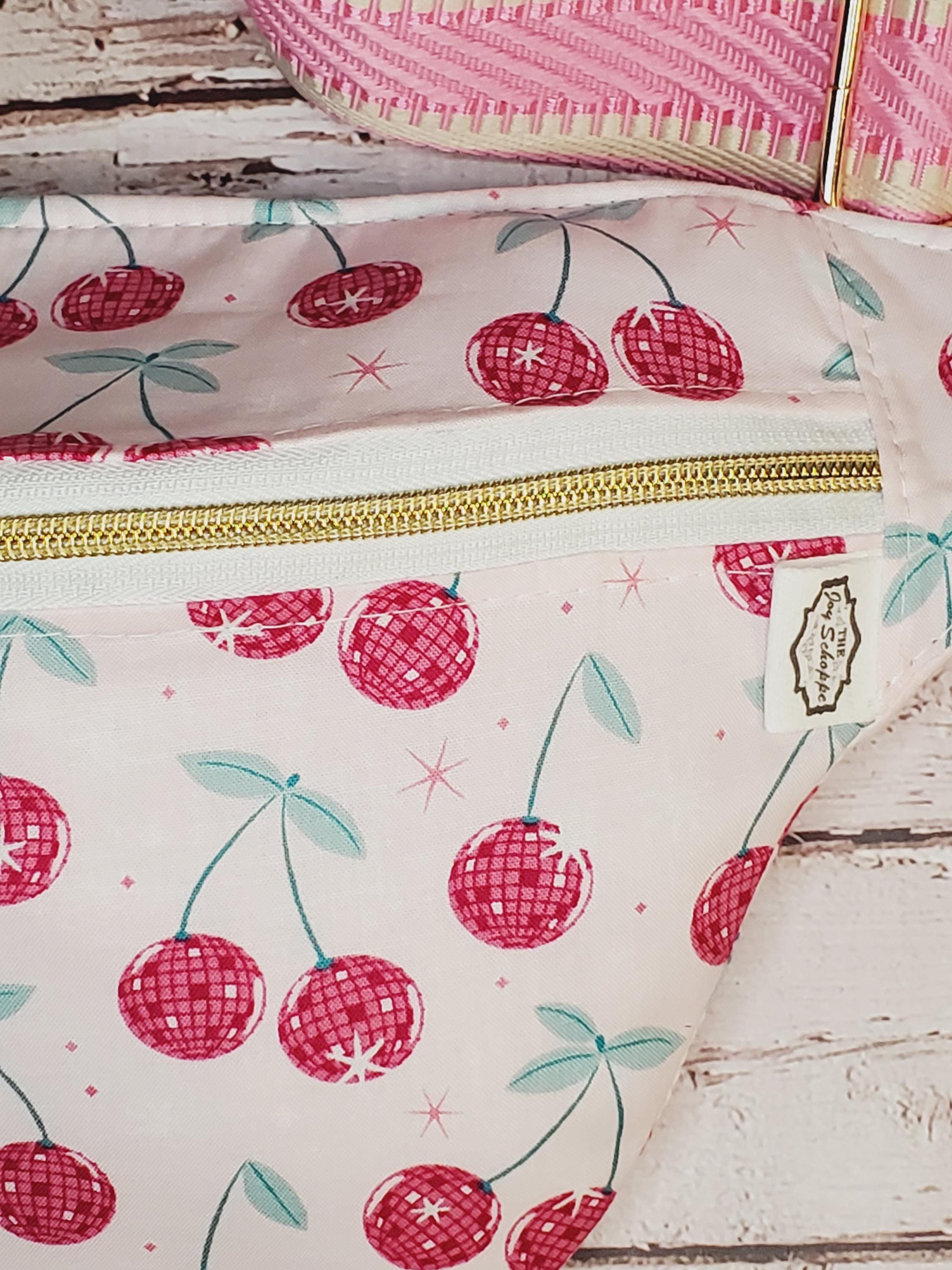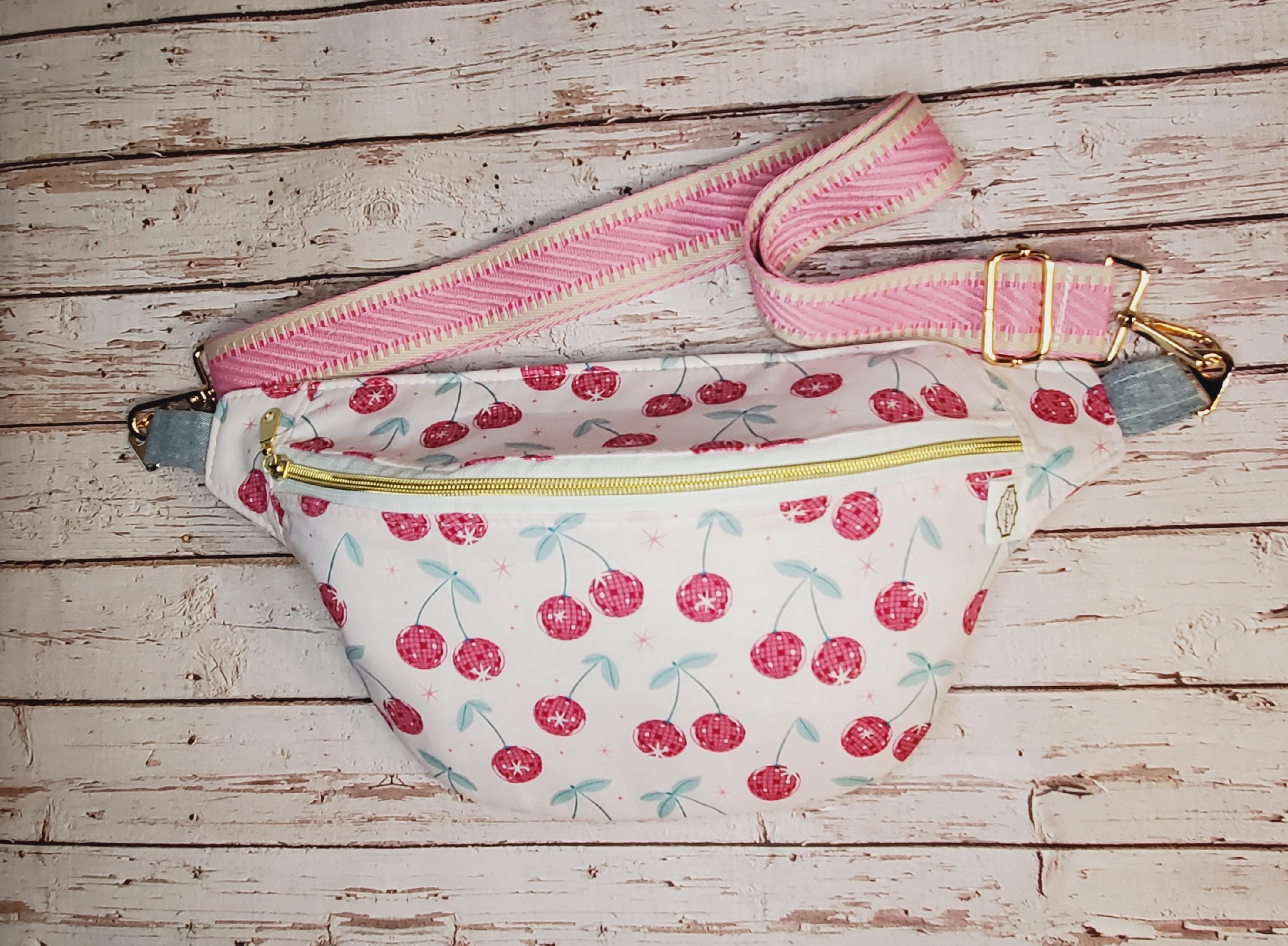 Handmade medium-sized Fanny Pack with this fun soft pink cotton fabric with disco cherries! This soft, woven fabric boasts a pattern of whimsical disco ball cherries!! It is sure to be a showstopper and conversation starter!! Let this beautiful neutral color scheme enhance your latest outfit. This fabric is perfect for all seasons! The accent fabric is a cotton denim blue that coordinates perfectly. The adjustable belt/strap and durable craftsmanship make it the perfect casual travel bag for an active lifestyle.